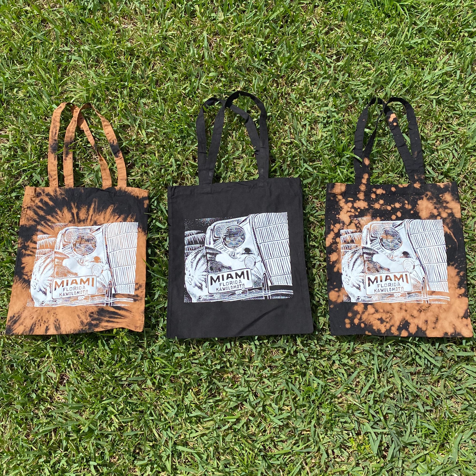 Reusable Custom Vintage Miami "Kawolomoto" Release tote to promote swag and sustainability.